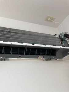 本体まわりをしっかり養生したうえで、エアコンを分解。
